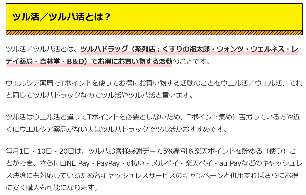 ツルハでもウエル活ほどの破壊力はないですが、キャンペーン日とクーポン・決済手段の組み合わせである程度お得な買い物はできるので、これを機にまとめておきます。