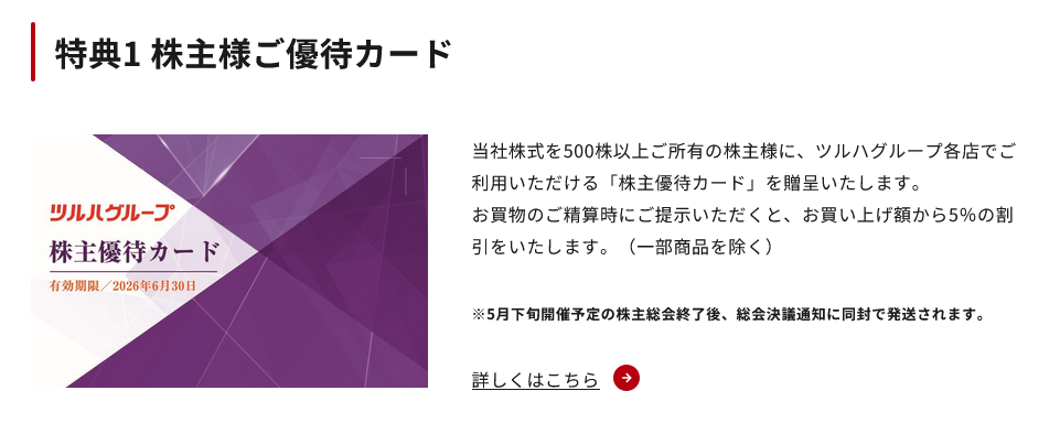 これは常時適用されるので非常にありがたいのですが、ツルハHDの株価は2600円台(2025年11月9日現在)、株主優待を得るには5単元買おうとすると100万円以上必要になりなかなか大変です…。